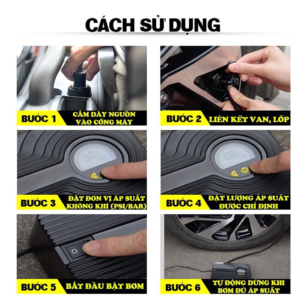 Công suất : 120W Nguồn điện : 12V Áp lực nén tối đa: 110PSI (nhỏ hơn 7kg/cm³) Khả năng bơm: 40L/phút Thời gian bơm liên tục: 10 phút Có đồng hồ điện tử cài đặt