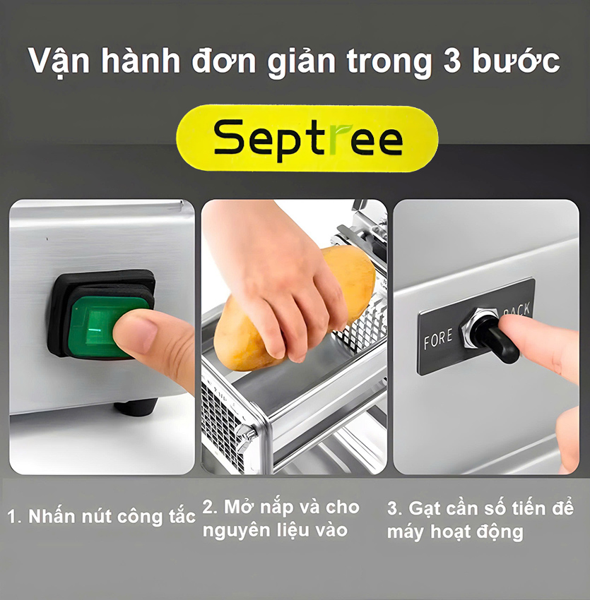 - Máy cắt rau củ Septree T1000 có chức năng cắt vuông nhiều loại củ quả như khoai lang, khoai tây, củ cải, cà rốt, su hào, dưa chuột… một cách nhanh chóng và đồng đều. Máy cắt khoai lang chiên thích hợp sử dụng trong các quầy đồ ăn nhanh, quán ăn vặt, KFC, quán cafe, nhà hàng, khách sạn hay các hộ kinh doanh nhỏ lẻ - Các món ăn từ khoai tây, khoai lang chiên, lắc đang là món ăn vặt hấp dẫn, và không thể thiếu trong thực đơn của các quán ăn nhanh, nhà hàng, hay cả trong các bếp ăn công nghiệp, bếp ăn trường học, các quán ăn vỉa hè,…