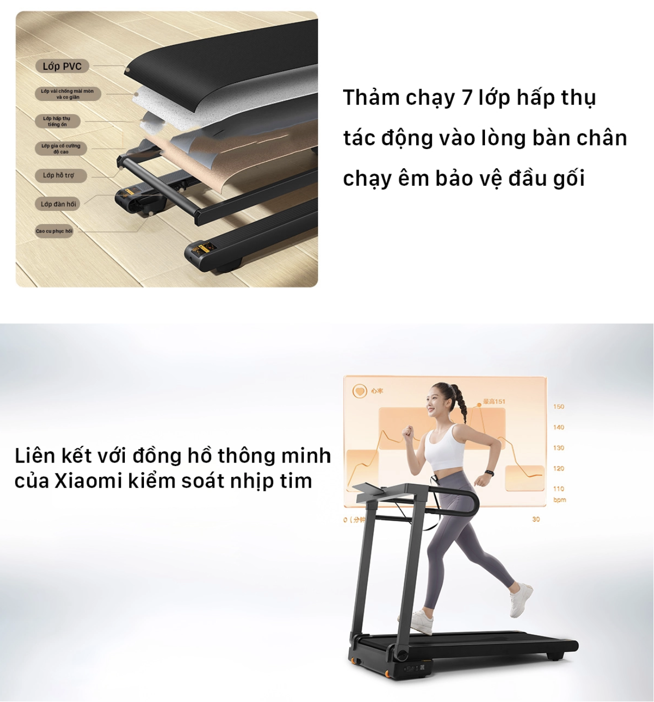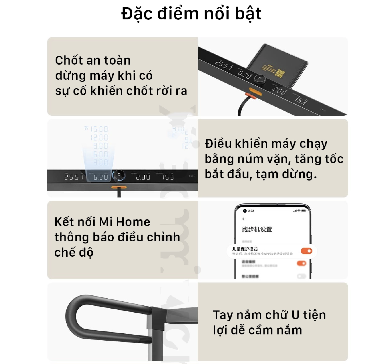 Sở hữu nhiều tính năng nổi bật như: thiết kế nguyên khối thảm chạy lớn, tay cầm có thể gập gọn, kết nối app Mi Home thông minh, thảm chạy 7 lớp chạy êm ái, chiều rộng thảm chạy 46cm, động cơ không chổi than.