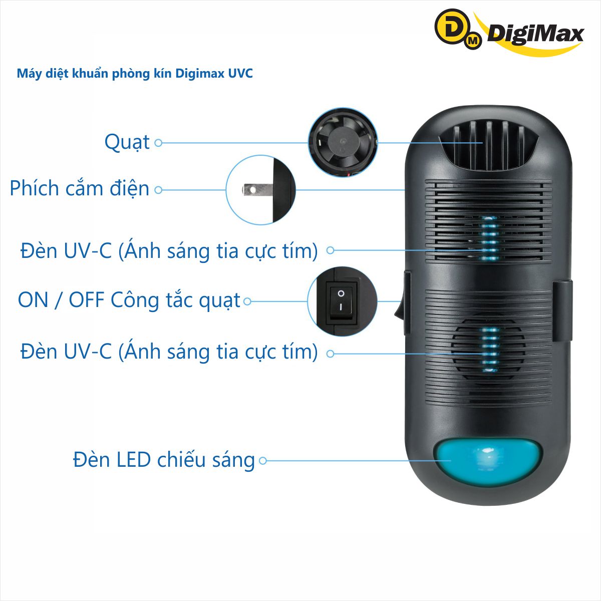 ✨Máy diệt khuẩn phòng kín Digimax UV-C, 30-50m2, 24/7, 10.000hr, AC 220V - Hàng Chính Hãng