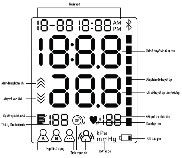 Màn hình LCD lớn hiển thị rất rõ kết quả Giới hạn đo: Huyết áp: 0 tới 299 mm Hg Nhịp tim: 40 tới 180 nhịp/phút Độ chính xác: Huyết áp: ±3 mm Hg Nhịp