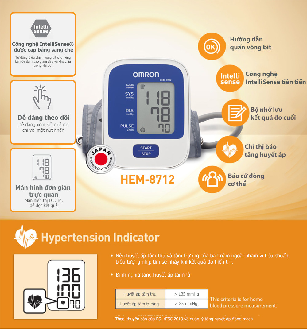 • Chỉ báo tăng huyết áp Biểu tượng nhịp tim nhấp nháy nếu huyết áp tâm thu hoặc tâm trương nằm ngoài phạm vi tiêu chuẩn (tâm thu trên 135 mmHg / tâm trương trên 85 mmHg
