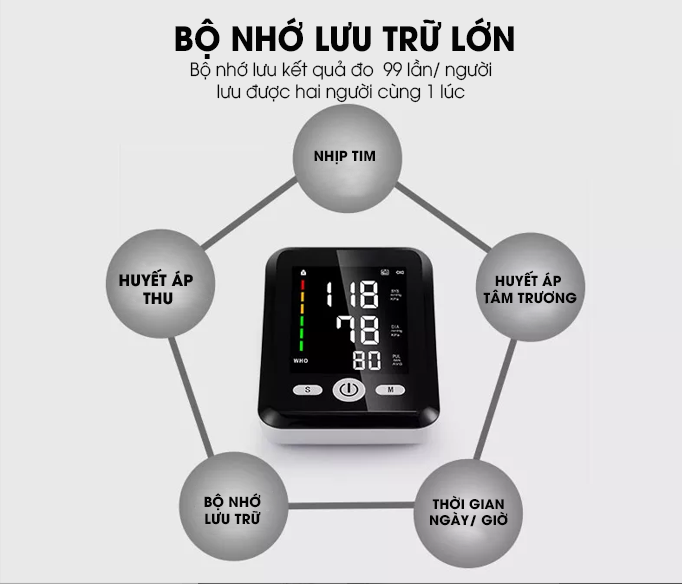 Máy đo huyết áp bắp tay - Chỉ báo mức theo dõi huyết áp theo tiêu chuẩn WHO. - Cảnh báo Phát hiện nhịp tim bất thường. - Bộ nhớ 90 lần x 2 người