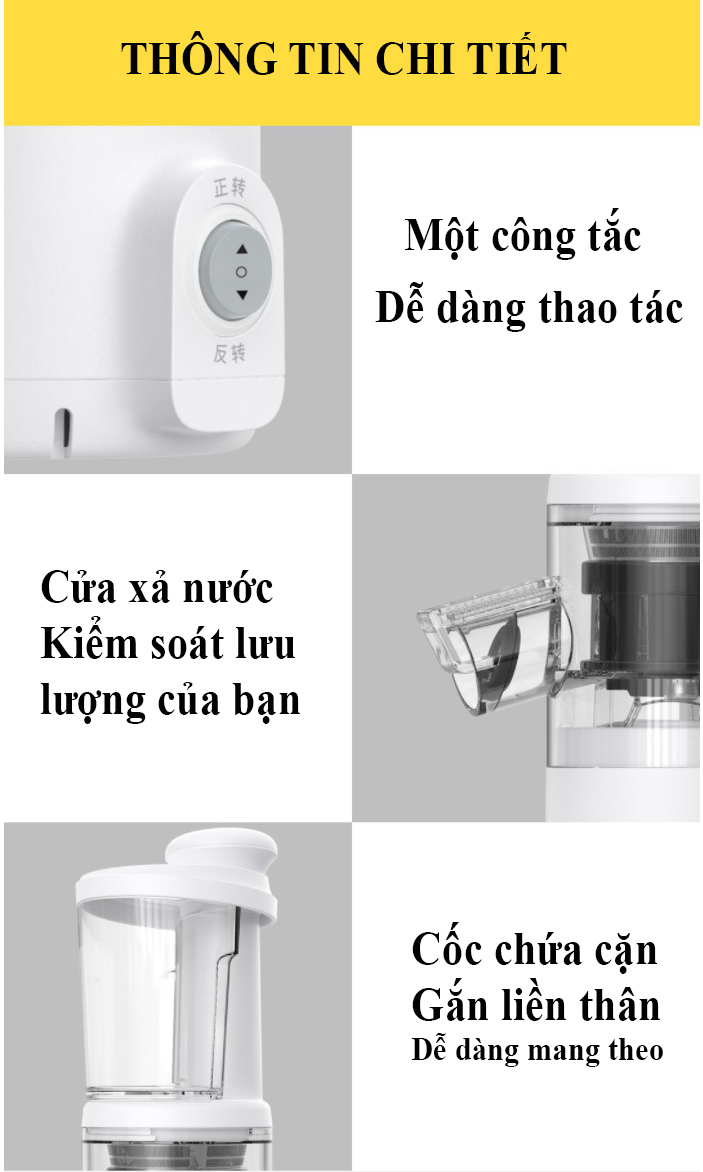 THÔNG TIN SẢN PHẨM - Khay ép cực lớn - Ép được 95% lượng nước từ rau quả - Lượng nước gấp đôi máy ép thường - Không lẫn bã vào nước - Vòng quay