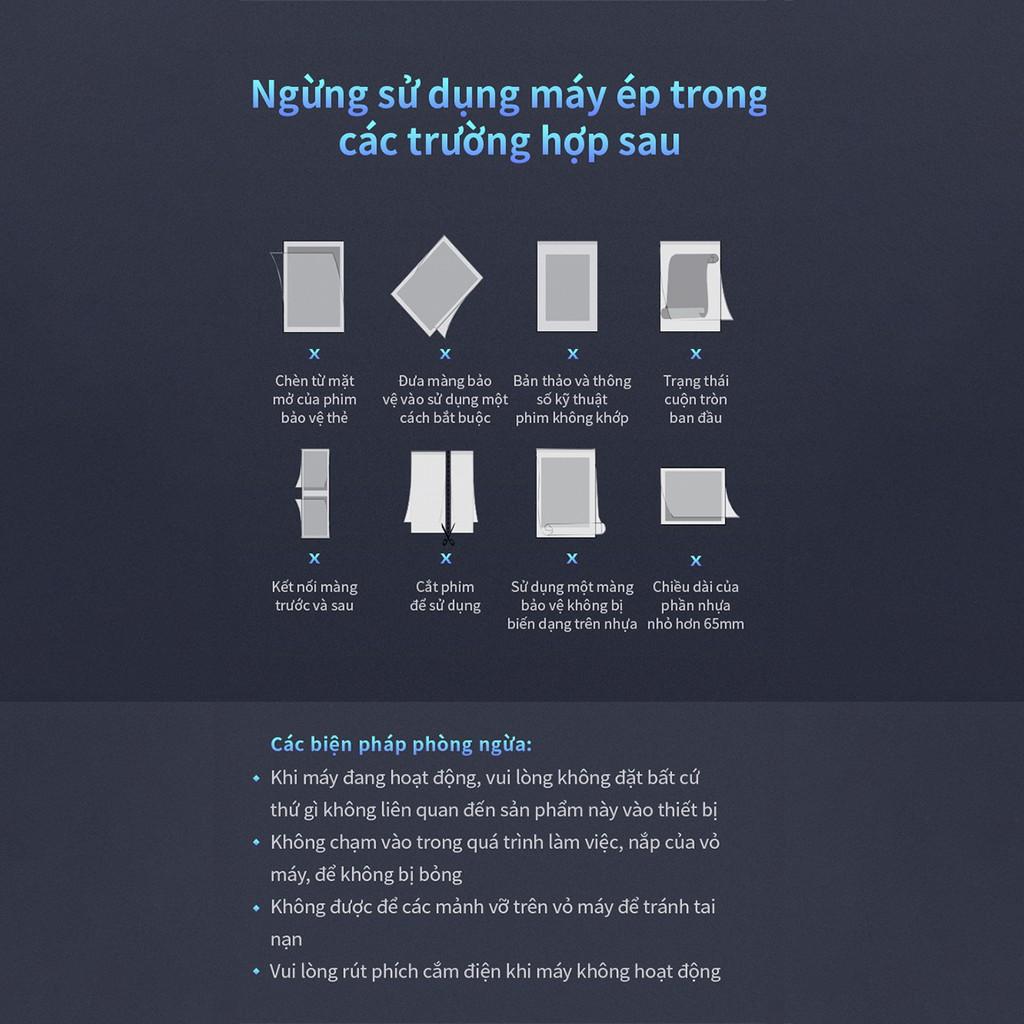 TÍNH NĂNG SẢN PHẨM: Máy ép plastic vỏ nhựa A4 độ dày ép nhựa dày nhất 0.6mm Dừng lại bằng tay, đảo ngược thủ công Có thể tùy chọn điều chỉnh nhiệt độ tốc độ ép nhựa 300mm/phút Độ dày ép plastic 80-175 mic, thời gian chạy liên tục 8 tiếng Công suất máy: 200W Thời gian khởi động làm nóng máy: 5p Nguồn cấp dữ liệu tự động, hiển thị được trạng thái máy (màu xanh/ đỏ). Có thể điều chỉnh kích thước ép như A5/B5/A4  Hạn chế tiếng ồn <55db  Phù hợp với việc bảo quản tài liệu, giấy tờ quan trọng như bằng cấp, giấy khen,….
