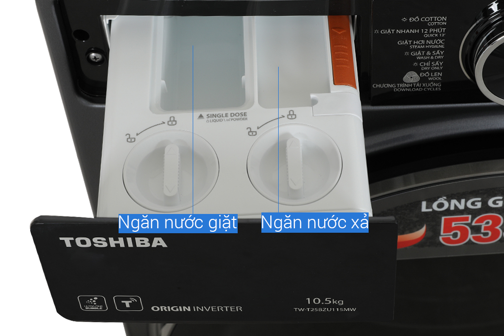 Máy giặt Toshiba Inverter 9.5 kg TW-T21BU105UWV(MG) mang thiết kế thanh lịch, gọn đẹp trong từng chi tiết, tích hợp 15 chương trình giặt đáp ứng nhu cầu giặt đa dạng trong gia đình, hỗ trợ