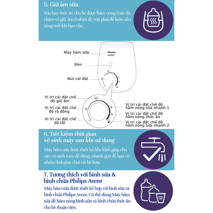 Dễ sử dụng bằng các hướng dẫn hâm nóng hữu ích Chỉ cần xoay núm để bật máy hâm sữa và chọn cài đặt hâm nóng của bạn. Máy hâm sữa có đi kèm một bảng tham khảo hâm nóng hữu ích để bạn có thể dễ dàng biết được quá trình hâm nóng sẽ mất bao lâu.