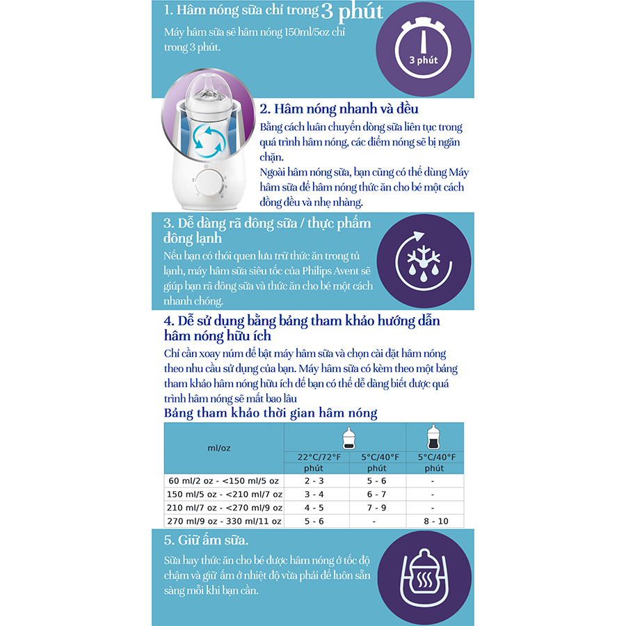 Hâm nóng nhanh chóng Vào những ngày bạn bận rộn nhất, hãy dùng máy hâm sữa Philips Avent giúp hâm sữa và thức ăn nhanh và đều chỉ trong 3 phút. Dễ vận hành, máy có cài đặt rã đông thuận tiện để có thể sử dụng hâm nóng thức ăn cho bé.