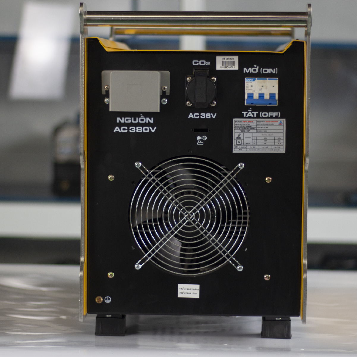 Máy có trọng lượng 45kg, được bao bọc bởi lớp sơn tĩnh điện màu vàng. Khác với các máy hàn truyền thống chỉ có 1 tay xách, HK MIG 500 trang bị 2 tay xách được làm bằng inox rất chắc chắn, giúp người dùng mang vác di chuyển dễ dàng.