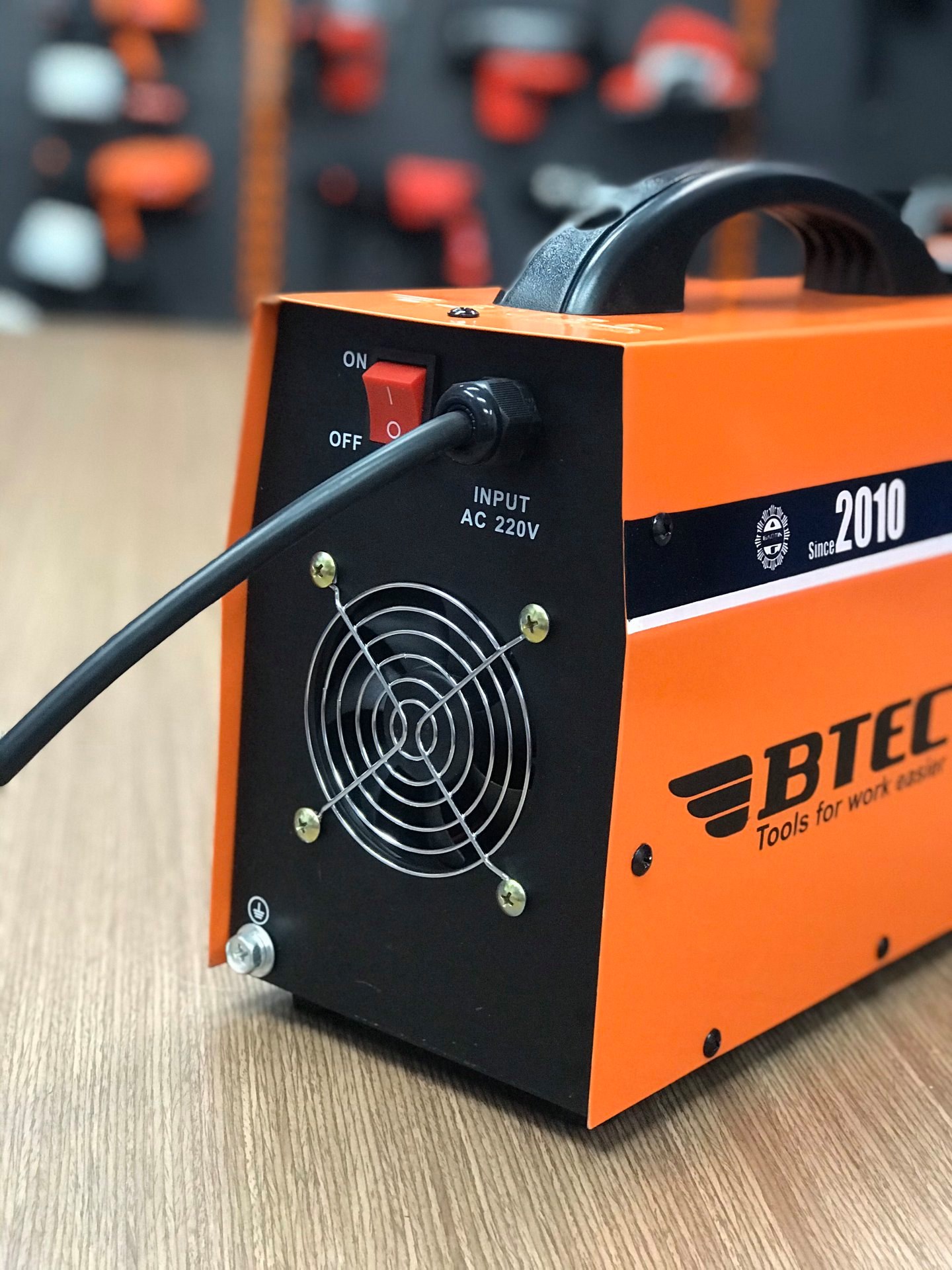 Mặt trên của máy hàn điện tử BTEC MMA-200 (xác lớn) bao gồm: Tay cầm chắc chắn vừa vặn, bên dưới là thông số và hiệu suất làm việc của máy. Ngoài ra thương hiệu " BTEC Tools make work easier " được dập nổi trên vỏ kim loại của máy