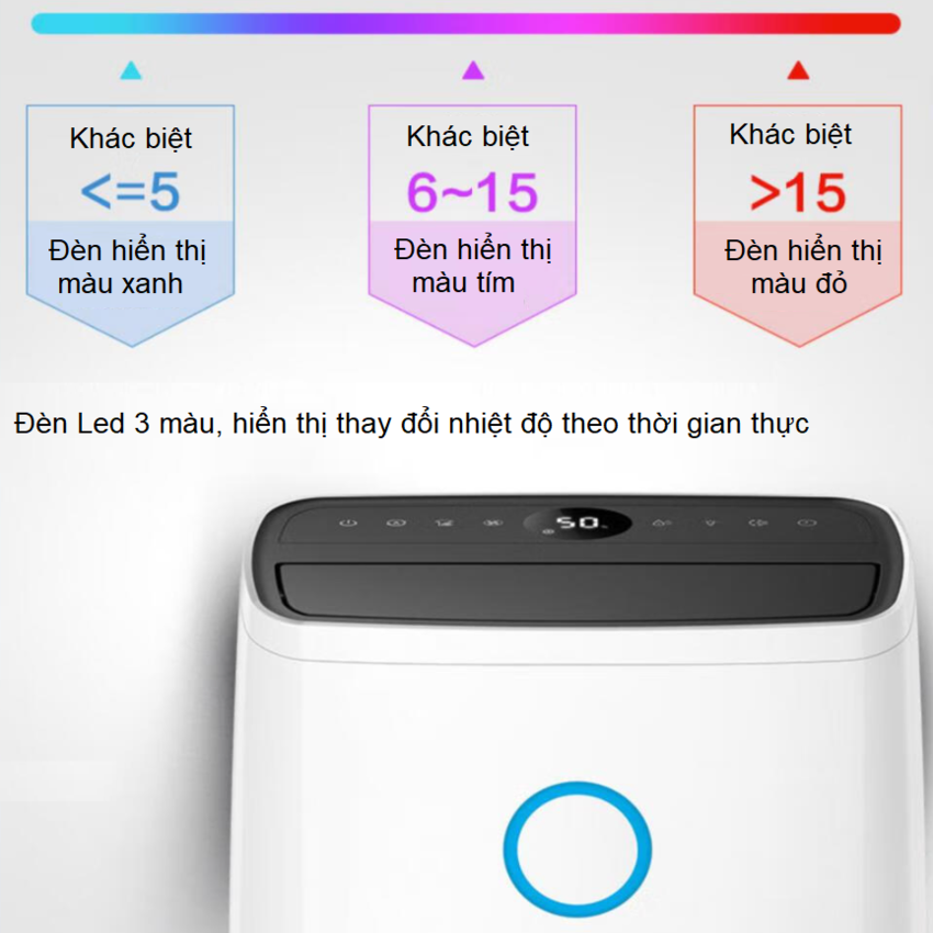 - Xem phản hồi kỹ thuật số theo thời gian thực về mức độ ẩm trong nhà của bạn, được kích hoạt bởi cảm biến độ ẩm thông minh bất cứ lúc nào. Cảm thấy tự tin khi biết độ ẩm trong nhà của bạn liên tục được theo dõi và hiển thị Vòng màu LED