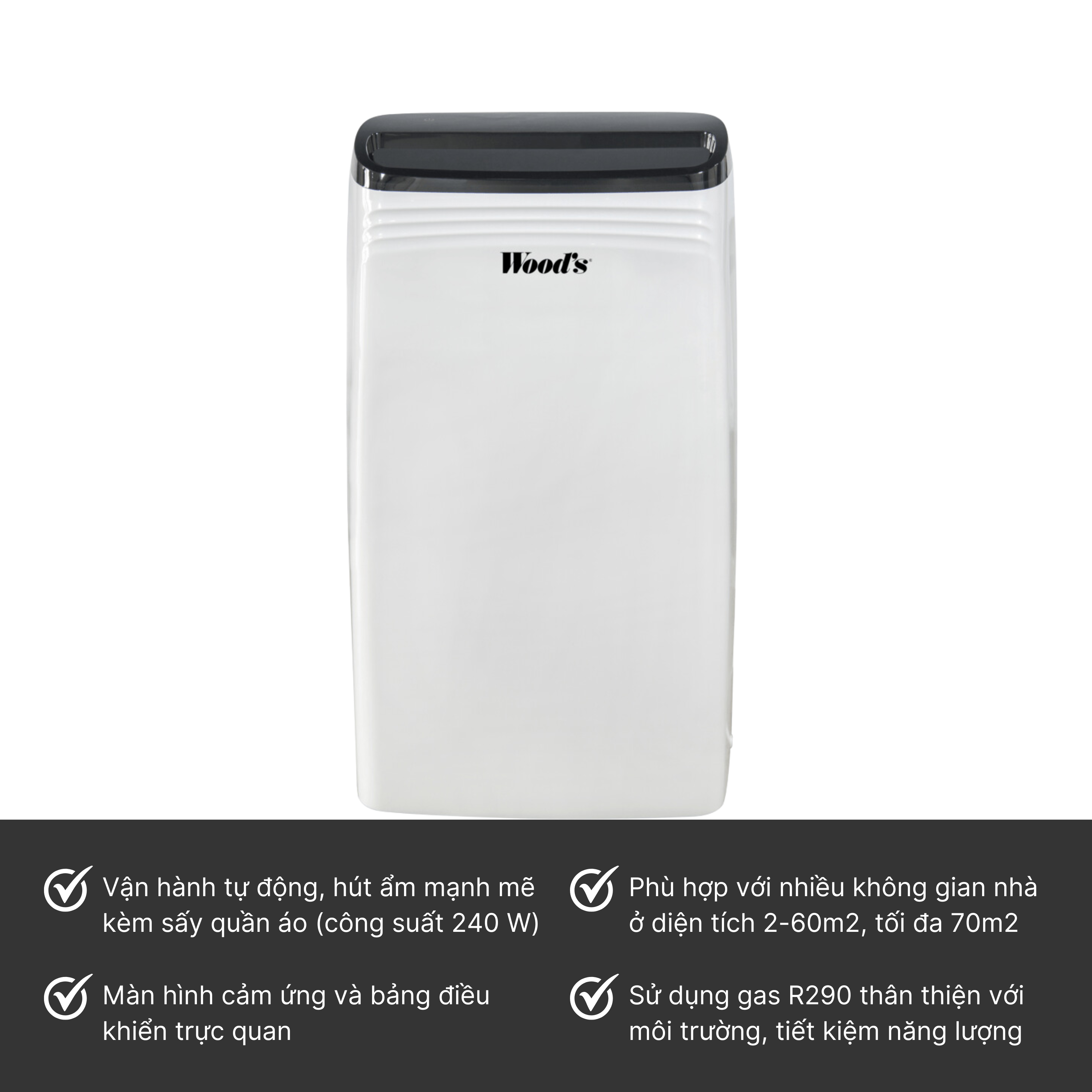 - Máy hút ẩm Wood’s MDK21 là một thiết bị chạy bằng máy nén có công suất mạnh mẽ (240 W), được tạo ra để hạ thấp độ ẩm trong không gian xung quanh, loại