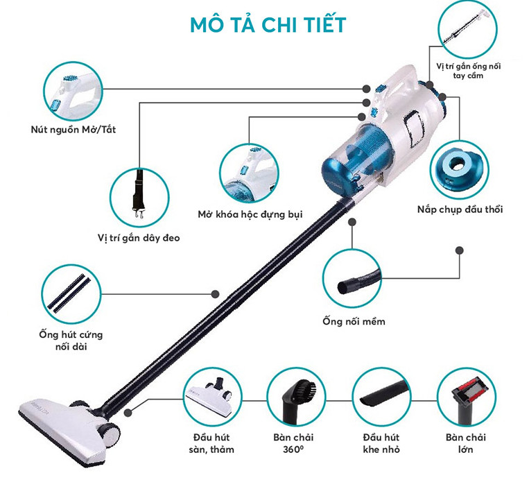 - Thân máy chính, ống hút bụi inox, vòi cầm tay, bàn chải Spider, bàn chải điện, bàn chải nhiều lông, bàn chải nhỏ, dây đeo vai, túi đựng. Ưu điểm