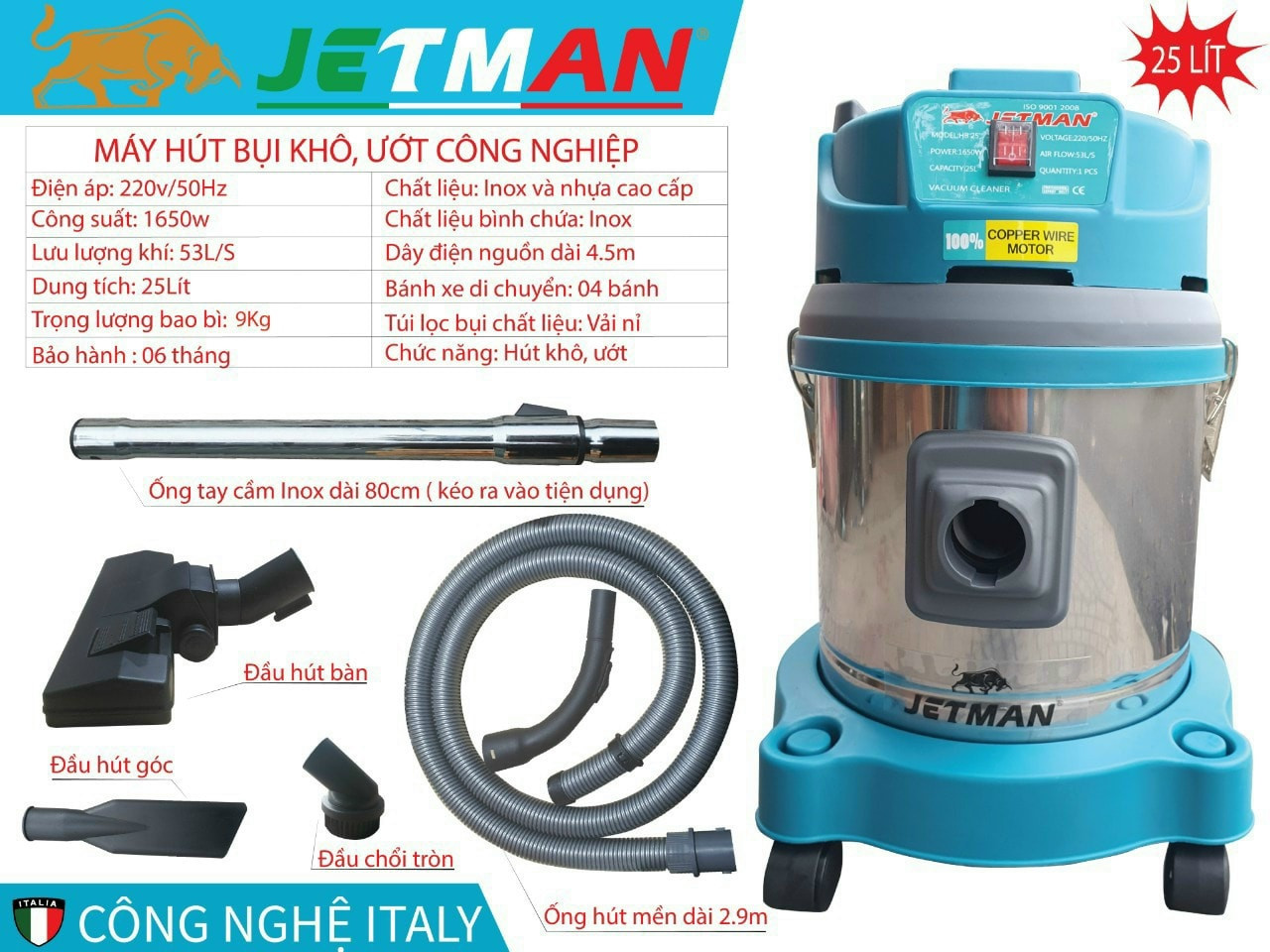 MÁY HÚT BỤI CÔNG NGHIỆP JETMAN ĐỦ DUNG TÍCH 25L -100L, LỰC HÚT SIÊU MẠNH