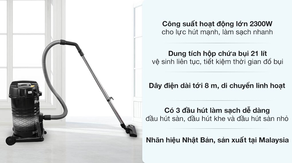 Máy hút bụi Panasonic với thiết kế công nghiệp, kiểu dáng chắc chắn, mạnh mẽ, có với bánh xe tiện di chuyển nhẹ nhàngCông suất hoạt động 2300 W cho lực hút mạnh mẽ, sử dụng hiệu quả cho các khu vực d...