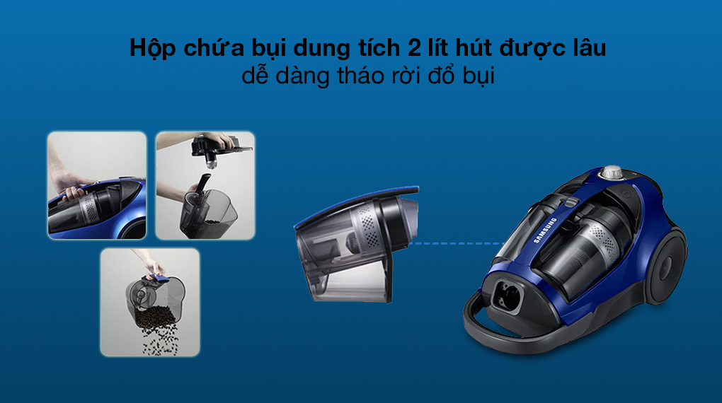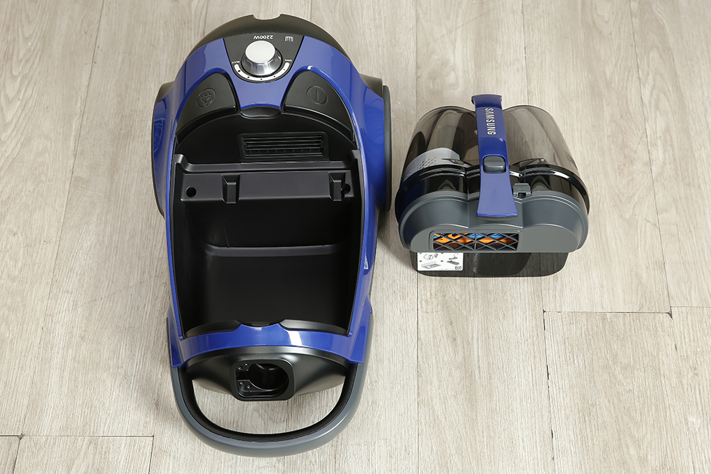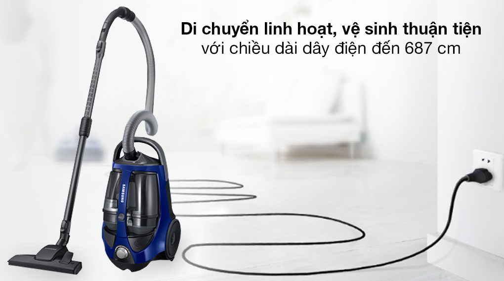 - Với chiều dài dây điện 7m cho phép di chuyển xa hơn để làm sạch mà không quá bất tiện, gọn gàng và thuận tiện trong việc cất giữ. Máy hút bụi màu xanh đậm bắt mắt, thiết kế nhỏ gọn với chiều rộng 28.2 cm - cao 28 cm - dài 49.2 cm, nặng 6 kg dễ di chuyển đến nhiều không gian trong nhà. Máy hút bụi Samsung VCC8836V36/X Tổng quan