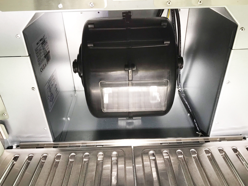 Hệ thống hút xả tuần hoàn và thông gió, khi dầu mỡ, mùi thực phẩm… được thu vào hệ thống và đi qua lưới lọc, sau đó được lọc qua than hoạt tính để khử mùi, dầu mỡ được giữ lại và đưa về cốc hứng mở trong máy. Khí sau khi được lọc sạch được đẩy ra khỏi máy thông qua đường ống thoát một chiều Ø 150mm.