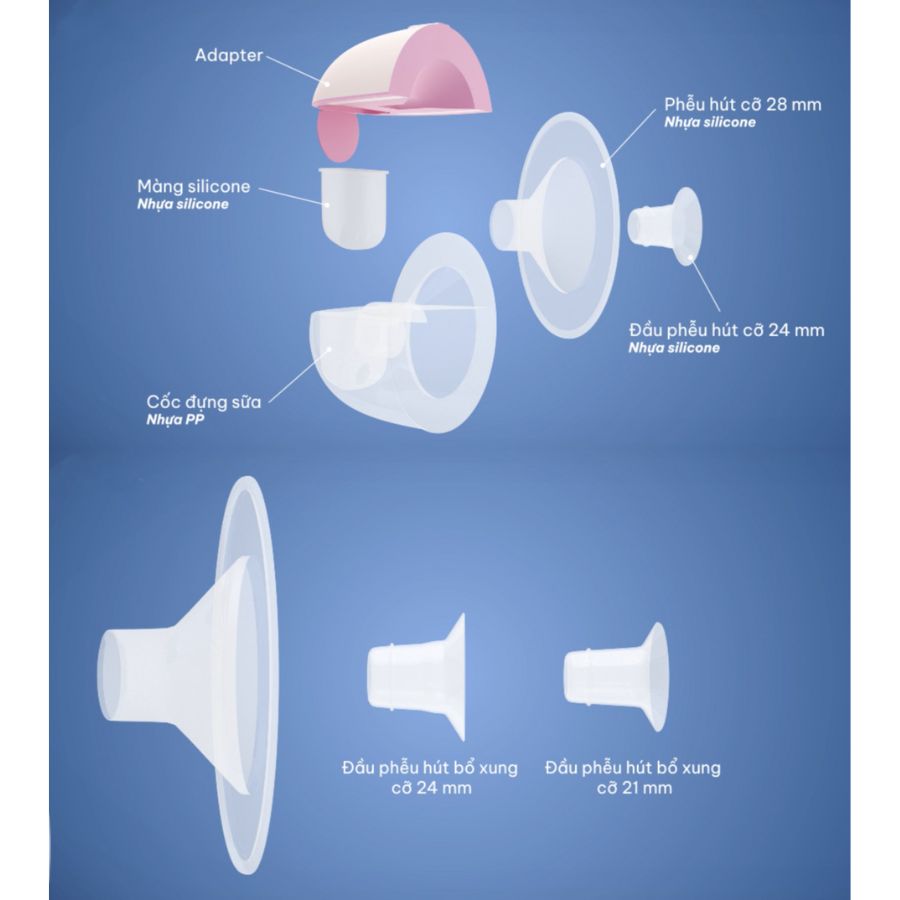 • Cung cấp 2 đầu phễu để cho mẹ lựa chọn tuỳ sở thích và kích cỡ : phễu hút bằng silicone siêu mềm (28mm) với hai đầu phễu silicone bổ trợ 21mm và 24 mm để lắp bổ sung.