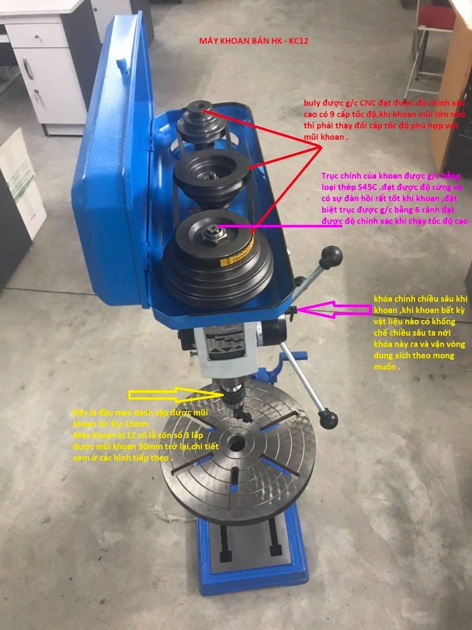 Sản phẩm máy khoan bàn HK-KC12 được trải qua các quy trình gia công kỹ càng, tỉ mỉ áp dụng các công nghệ, kỹ thuật hiện đại theo công nghệ mới hoàn toàn tự động (CNC) của Nhật Bản giúp độ chính xác giữa các then (rãnh) là 0.05 mm (5/100), toàn bộ chi tiết được mài chính xác 0.005 mm (5/1000), hệ thống trục đỡ được làm bằng nguồn nguyên liệu thép chất lượng cao S45C đã được trải qua quá trình chế biến kỹ càng nhằm tăng độ bền cho sản phẩm.