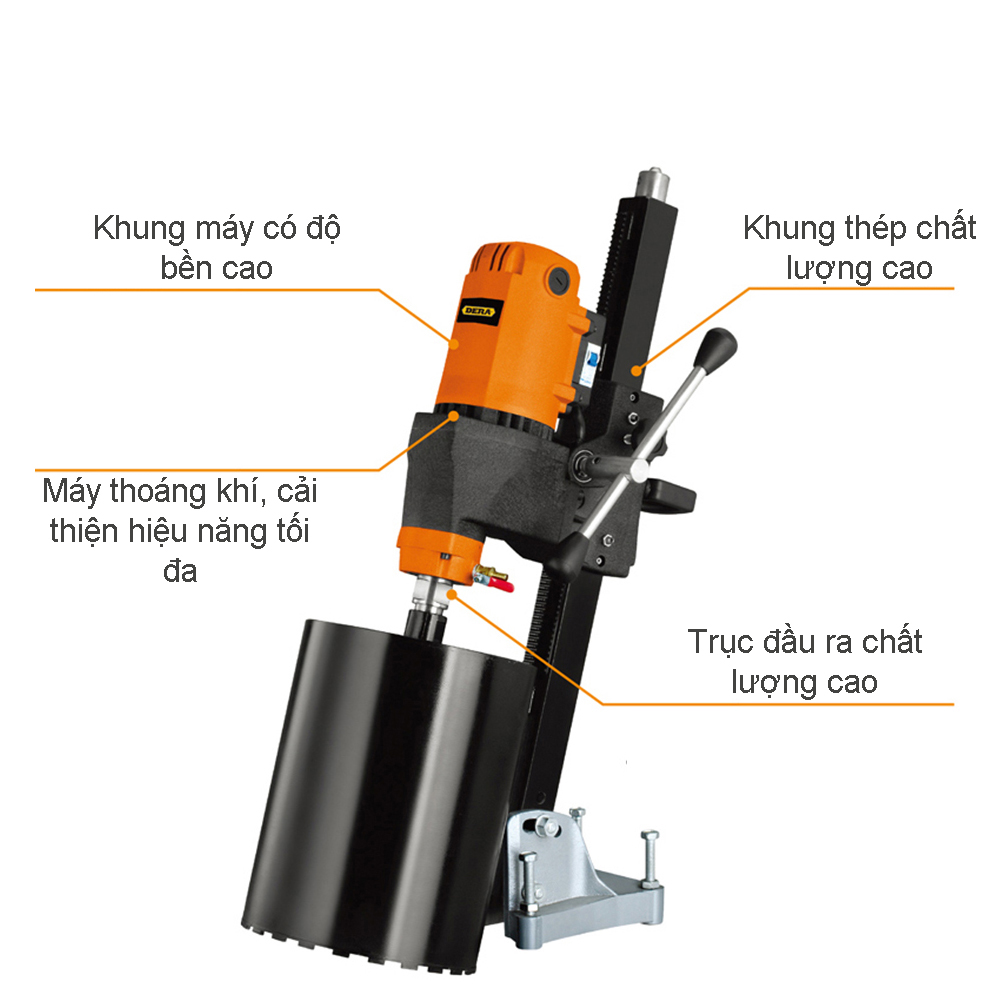 Máy Khoan Rút Lõi DERA Phi 235 - Khoan Rút Lõi Bê Tông Cầm Tay Chuyên Dùng Cho Các Vật Liệu Cứng Như Gạch ,Đá , Bê Tông  Ứng Dụng Trong Ngành Xây Dựng – Hàng Chính Hãng Đặc điểm của máy khoan rút lõi :