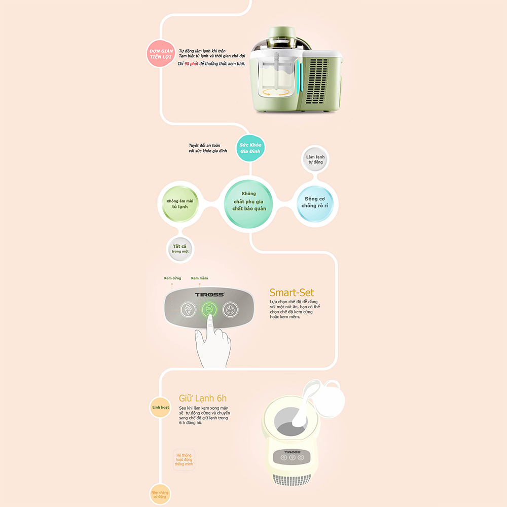 Ứng dụng công nghệ Ba Lan Máy Làm Kem Hoàn Toàn Tự Động Tiross TS9090 (Xanh) có kiểu dáng nhỏ gọn, màu sắc đẹp mắt và sở hữu tính năng hiện đại, giúp bạn tự làm món kem thơm ngon, mát lạnh ngay tại nhà. Sản phẩm được thiết kế và ứng dụng công nghệ hiện đại của Ba Lan, mang lại sự tiện nghi cho mọi gia đình. Tiết kiệm thời gian Sản phẩm ứng dụng công nghệ hướng đến sự tiện nghi cho người dùng với 1 con chip thông minh có tên gọi Chip E-COOL. Chip E-COOL có khả năng làm lạnh siêu tốc, chỉ 90 phút cho một lần làm kem và thời gian giữ lạnh lâu gấp 2 lần máy làm kem thông thường giúp tiết kiệm điện năng cũng như thời gian chế biến. Hoạt động tự động và thông minh Máy Làm Kem Hoàn Toàn Tự Động Tiross TS9090 (Xanh) chính hãng dễ dàng sử dụng chỉ với một thao tác. Bằng 1 nút ấn, máy sẽ tự động làm kem và tự động dừng khi hoàn tất quá trình làm kem rồi chuyển sang chế độ giữ lạnh trong 6 tiếng. Ngoài ra, để máy làm kem theo sở thích cá nhân, bạn có thể chọn chế độ kem cứng hoặc kem mềm. Với cách sử dụng đơn giản, bạn có thể trổ tài khéo léo, chế biến món kem mát lạnh ngày nóng cho cả nhà cùng thưởng thức. Chất liệu an toàn, thiết kế tiện dụng Máy được làm từ chất liệu nhựa tổng hợp và nhôm cao cấp có khả năng chịu lực, an toàn cho sức khỏe tuyệt đối. Ngoài ra, hệ thống làm lạnh tự động nhờ đó động cơ hạn chế sự rò rỉ, an toàn cho quá trình sử dụng. Sản phẩm có thiết kế tiện dụng, nắp bằng nhựa trong suốt có thể quan sát được quá trình làm kem, đồng thời nắp có lỗ cho phép bạn bỏ thêm nguyên liệu cả khi máy đang hoạt động. An toàn cho sức khỏe Sử dụng máy làm kem Tiross bạn không cần sử dụng đến tủ lạnh, nên không lo ngại kem ám mùi thức ăn, thực phẩm tươi sống. Kem tự chế biến tại nhà bằng trái cây không chứa chất phụ gia, chất bảo quản như các loại kem thông thường, tuyệt đối an toàn cho sức khỏe gia đình bạn. Hướng dẫn sử dụng