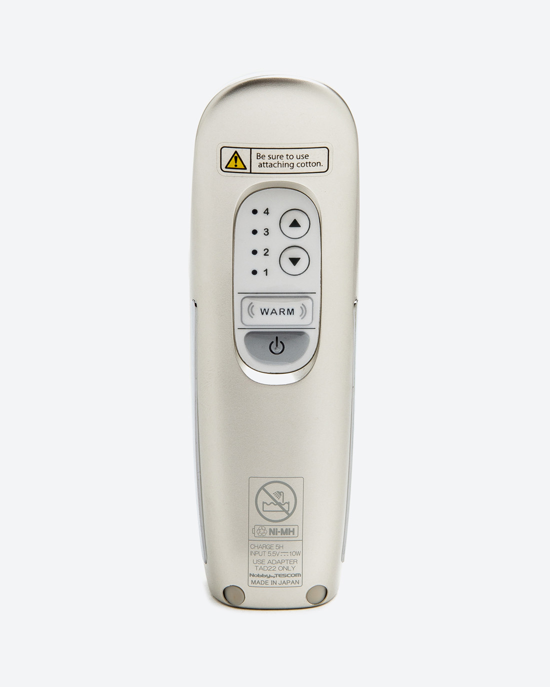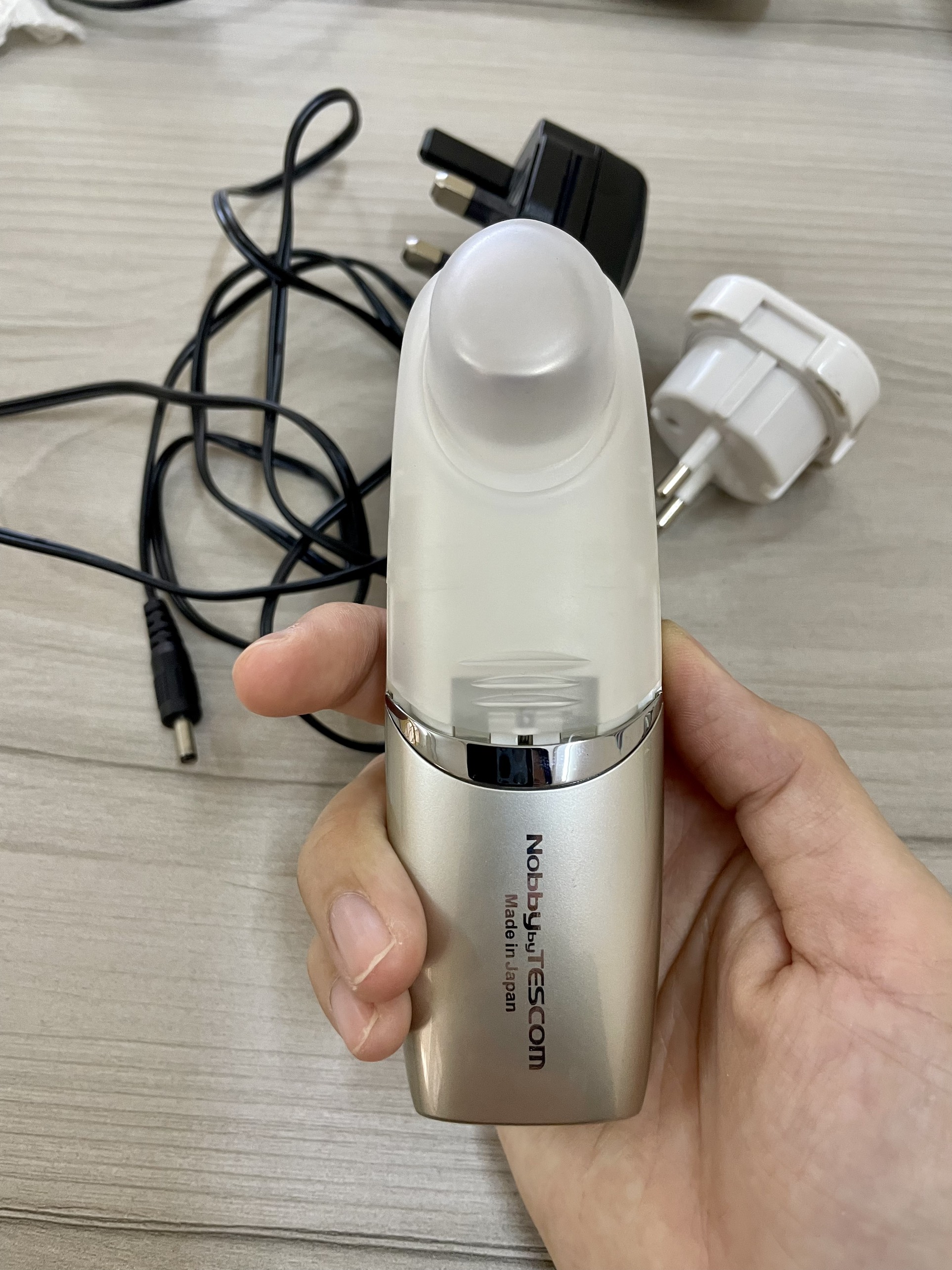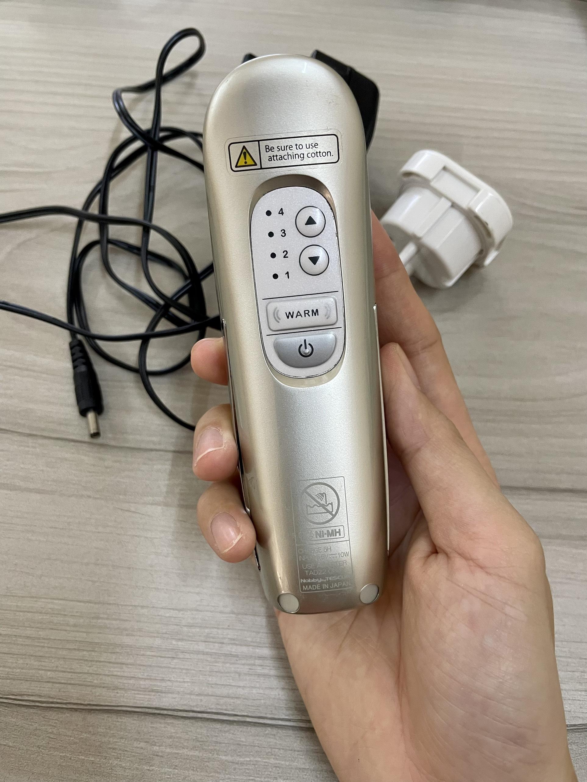 - Thiết kế nhỏ gọn, dễ sử dụng, an toàn. Lưu ý: Máy làm làm sạch sâu da mặt không phải là máy rửa mặt. Chỉ sử dụng để làm sạch sâu, sau bước rửa mặt thông thường CƠ CHẾ HOẠT ĐỘNG CỦA SÓNG VI DÒNG Sóng vi dòng thâm nhập lên bề mặt da đến tận các mô sâu hơn bên dưới, cung cấp oxy và chất dinh dưỡng cần thiết cho tế bào. Kích thích sản xuất các chất tự nhiên collagen và elastin. Vùng da cần chăm sóc được cải thiện, da đầy đặn và sáng hồng tự nhiên. CƠ CHẾ HOẠT ĐỘNG CỦA ION Bằng công nghệ ion, bụi bẩn và dầu dư thừa trên da mang điện tích âm được hút ra khỏi lỗ chân lông bằng đầu mang điện tích dương Sản phẩm lý tưởng cho người gặp vấn đề mụn trứng cá và dầu dư thừa vì ion dương hỗ trợ làm sạch dầu nhờn và chất bẩn gây mụn ra khỏi làn da. HƯỚNG DẪN DÙNG MÁY LÀM SẠCH SÂU DA MẶT TESCOM NTE20 Chăm sóc da với thiết bị này cần được thực hiện kiên trì và đều đặn tối thiểu hai lần mỗi ngày, đối với mỗi chức năng thì thời gian sử dụng nên trong vòng 3 phút cho mỗi lần. Không sử dụng thiết bị liên tục và quá thời gian hướng dẫn để bảo vệ làn da. THÔNG SỐ KỸ THUẬT Model (mã hàng) : NTE10 Thương hiệu : TESCOM Công dụng : Làm sạch sâu da mặt và se khít lỗ chân lông, chăm sóc da khoẻ và sạch sâu. Kích thước : Cao 13 x Rộng 4.1 x Đường kính 3.8 (cm) Trọng lượng : 110g (thân máy chính) Điện sạc pin : AC 100V-240V 50/60Hz (Việt Nam dùng điện 220V) Loại pin : Pin Nickel Metal Hydride Battery (DC3.6V, 750mAh) Thời gian sử dụng : 3 phút/lần (ngày dùng tối đa 2 lần) Màu sắc : Gold Sản xuất tại : Tescom Denki – Nhật Bản Bảo hành: Có thẻ bảo hành kèm theo máy. Báo hành 01 năm. Lưu ý không sử dụng cho các trường hợp