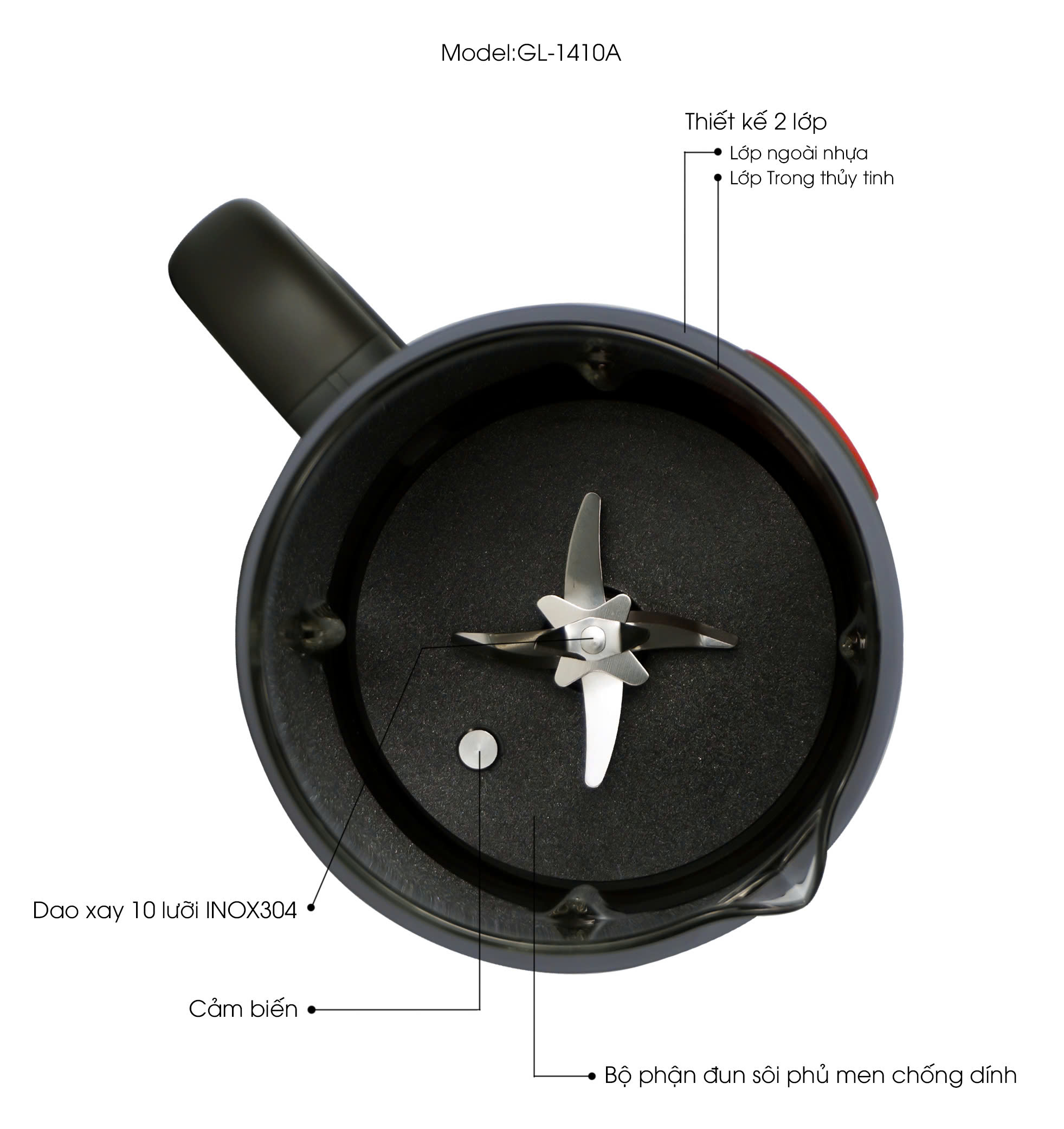 Dao xay 10 lưỡi inox 304 sắc bén, ít bị mài mòn, bền bỉ theo thời gian, bộ phận đun sôi phủ men chống dính dễ dàng vệ sinh.