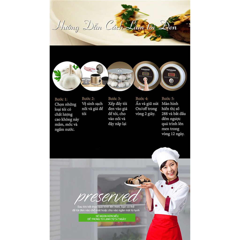 Máy làm tỏi đen TS906 là dòng máy làm tỏi đen gia đình được ưa chuộng nhất trên thị trường hiện nay. Máy làm tỏi đen Tiross TS906 có 2 chức năng: làm tỏi 1