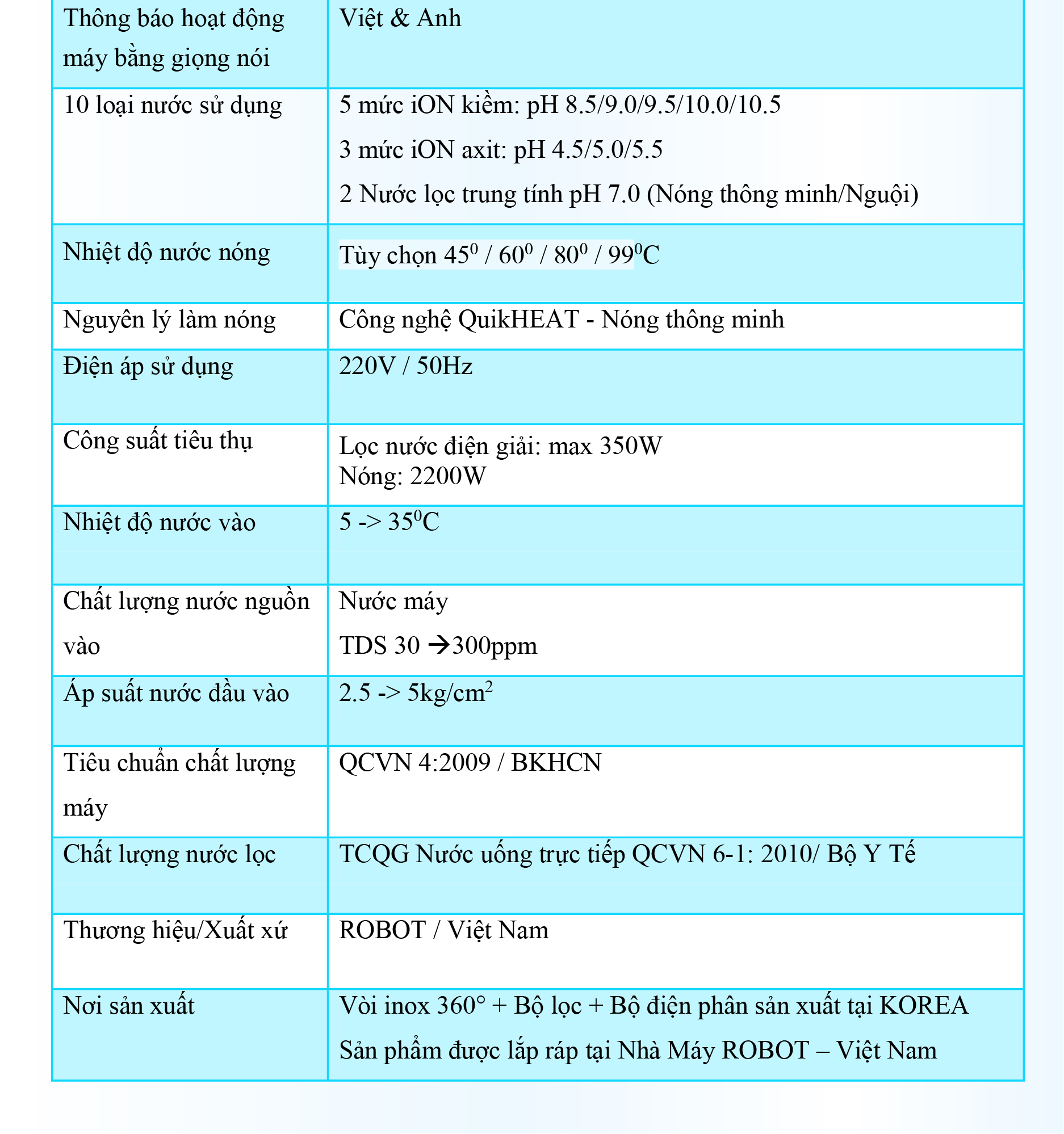- ️ Máy lọc nước điện giải iON kiềm ROBOT ionSmart 510 là sản phẩm được sản xuất với công nghệ tiên tiến, cao cấp trang bị đến 5 tấm điện cực lớn nhất, có khả năng tạo ra đến 10 loại nước đa chức năng, với 5 mức nước iON kiềm (pH 8.5 – 10.5), nước lọc trung tính (pH 7.0) Nguội – Nóng & 3 mức nước iON axit (pH 4.5 - 5.5). Chất lượng nước đạt chỉ số tối ưu, nồng độ Hydro hoạt tính lên đến ~ 750 -> 850 ppb, chống oxy hóa (ORP) lên đến ~ -350 -> -500 mV, đáp ứng mọi nhu cầu sử dụng trong cuộc sống.