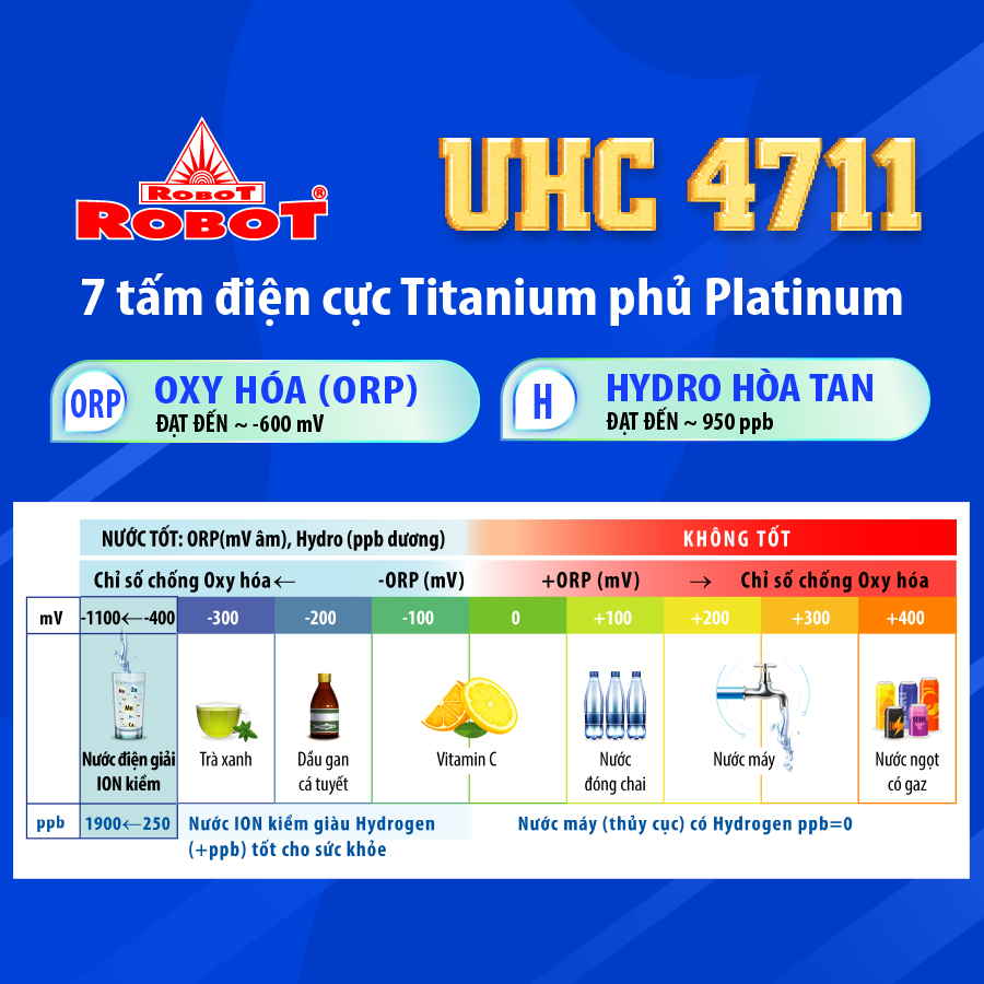 Máy lọc nước điện giải iON kiềm ROBOT UHC 4711 là model đặc biệt sản xuất với công nghệ tiên tiến hàng đầu thế giới, trang bị đến 7 tấm điện cực lớn nhất, có khả năng tạo ra đến 11 loại nước đa chức năng, với 5 mức nước iON kiềm (pH 8.5 - 10.5), nước lọc trung tính - Nóng - Lạnh (pH 7.0) & 3 mức nước iON axit (pH 4.5 - 5.5), có thể điều chỉnh, thay đổi tùy theo đặc tính nguồn nước tại nơi lắp đặt. Với nồng độ Hydro hoạt tính lên đến ~800 -> 950 ppb, chống oxy hóa (ORP) lên đến ~-400 -> -600 mV, đáp ứng mọi nhu cầu sử dụng trong cuộc sống.