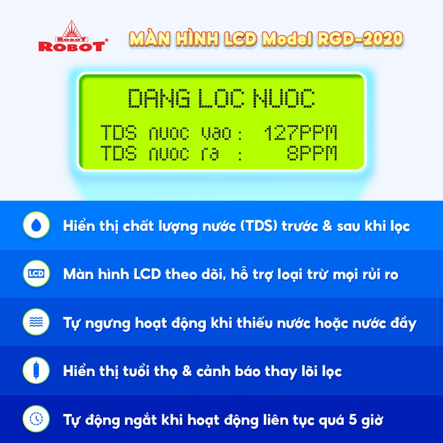 - Các sản phẩm máy lọc nước ROBOT đều sở hữu màn hình LCD sắc nét, hiển thị chi tiết các thông số TDS – chất lượng nước trước & sau lọc, tuổi thọ lõi lọc 24/24… để mọi người đều dễ dàng theo dõi hoạt động máy, chất lượng nước uống thông qua màn hình LCD, loại trừ mọi rủi ro, mang đến sự an toàn tuyệt đối khi sử dụng. 3. Kiểu dáng tinh tế, đa chức năng, tiện lợi