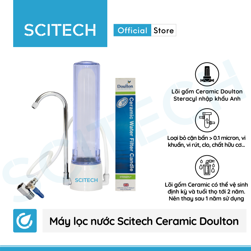 Máy lọc nước Scitech Ceramic với 1 cấp lọc tích hợp hiện đại là lõi Gốm Ceramic Doulton Steracyl xuất xứ Anh có khả năng loại bỏ hoàn toàn các tạp chất, cặn bẩn,