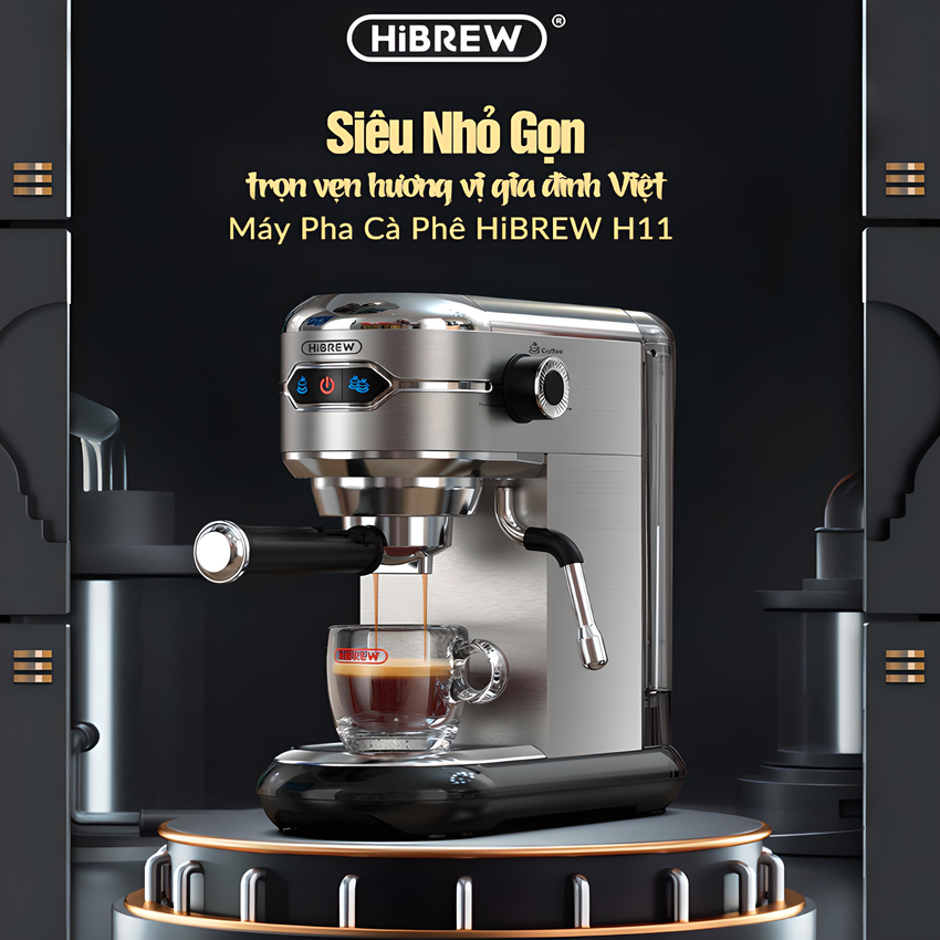 - Máy pha cà phê Espresso chuyên nghiệp HiBREW H11 có công suất hoạt động là 1450W, áp suất 19 bar. Đáp ứng được nhu cầu sử dụng tại các văn phòng, quán cà phê, khách sạ Hệ thống gia nhiệt tiên tiến "NTC"