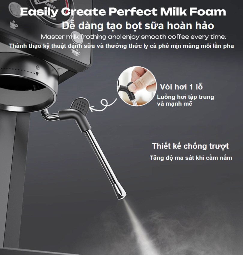 Bơm Italy áp suất 20 bar tạo ra tách cà phê đậm đà Công suất 1400W, điện áp 220-240V/50Hz-60Hz Gia nhiệt nhanh chóng, đảm bảo cà phê chiết xuất với nhiệt độ lý tưởng nhất
