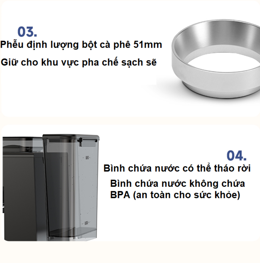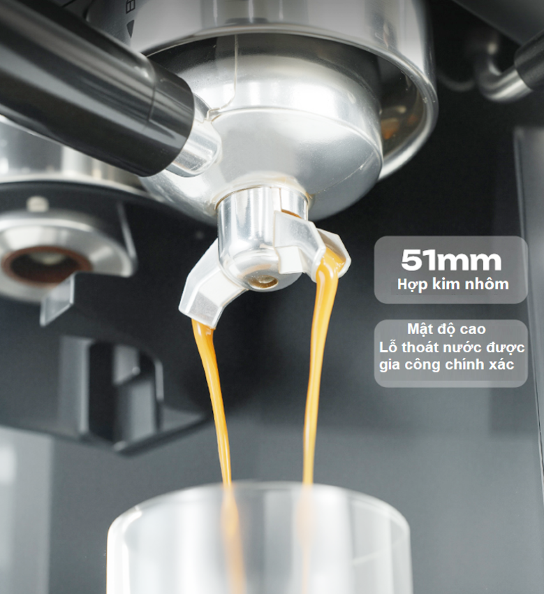 - Bộ phụ kiện bao gồm: 1 máy chủ; 1 tay pha 51mm ; x2 phin lọc inox ; 1 tay nén kiêm thìa; 1 phễu định lượng; 1 sách HDSD