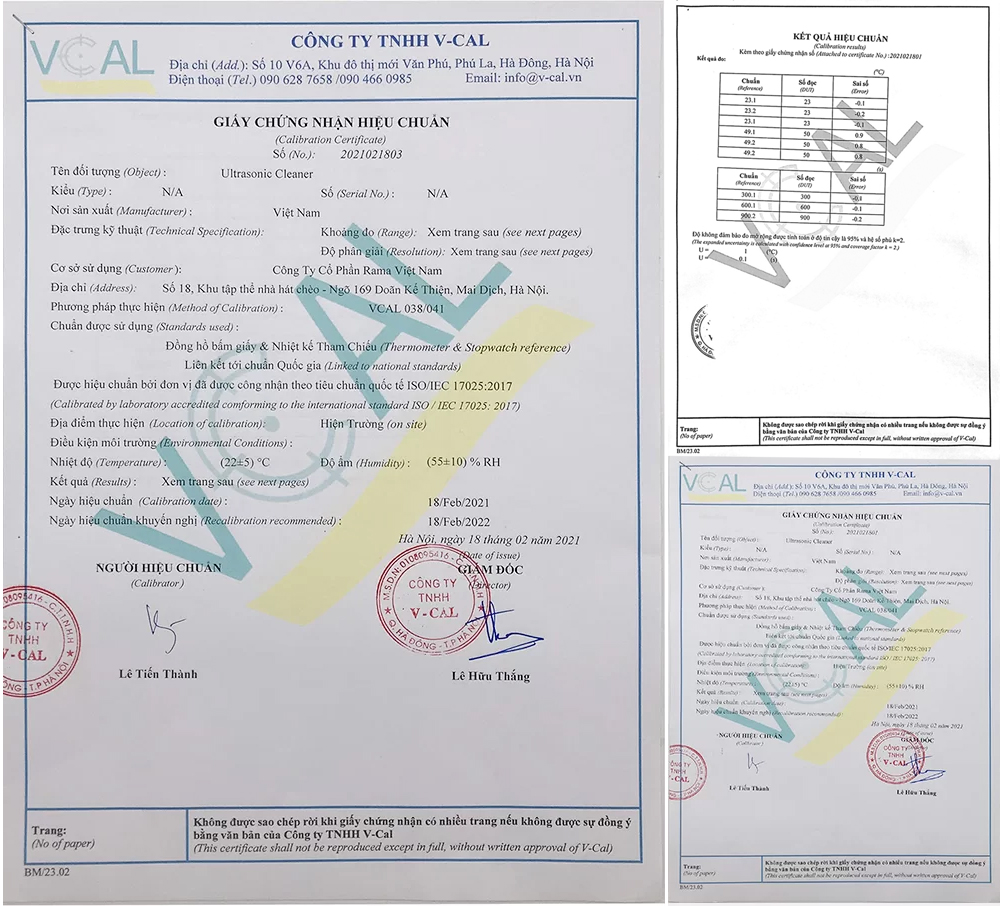 - Bể siêu âm Rama đã được cấp Giấy chứng nhận hiệu chuẩn bởi V-CAL.