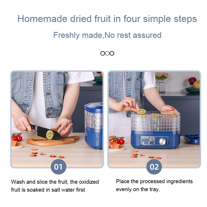 - Ngoài ra, máy sấy có 5 khay sấy riêng biệt được làm bằng nhựa cao cấp dạng lưới giúp thực phẩm được sấy khô một cách đồng đều và an toàn cho sức khỏe. Bạn có thể dùng cả 5 khay hoặc ít hơn tùy theo số lượng thực phẩm hay hoa quả cần sấy. Như vậy bạn không còn phải bận tâm đến lượng hoa quả dồi dào trong tủ lạnh mà chưa thể tiêu thụ hết. Các khay sấy có thể tháo rời ra, xếp chồng lên nhau gọn gàng, thuận tiện trong việc vệ sinh và bảo quản sau các lần sử dụng. Sử dụng dễ dàng với 3 bước
