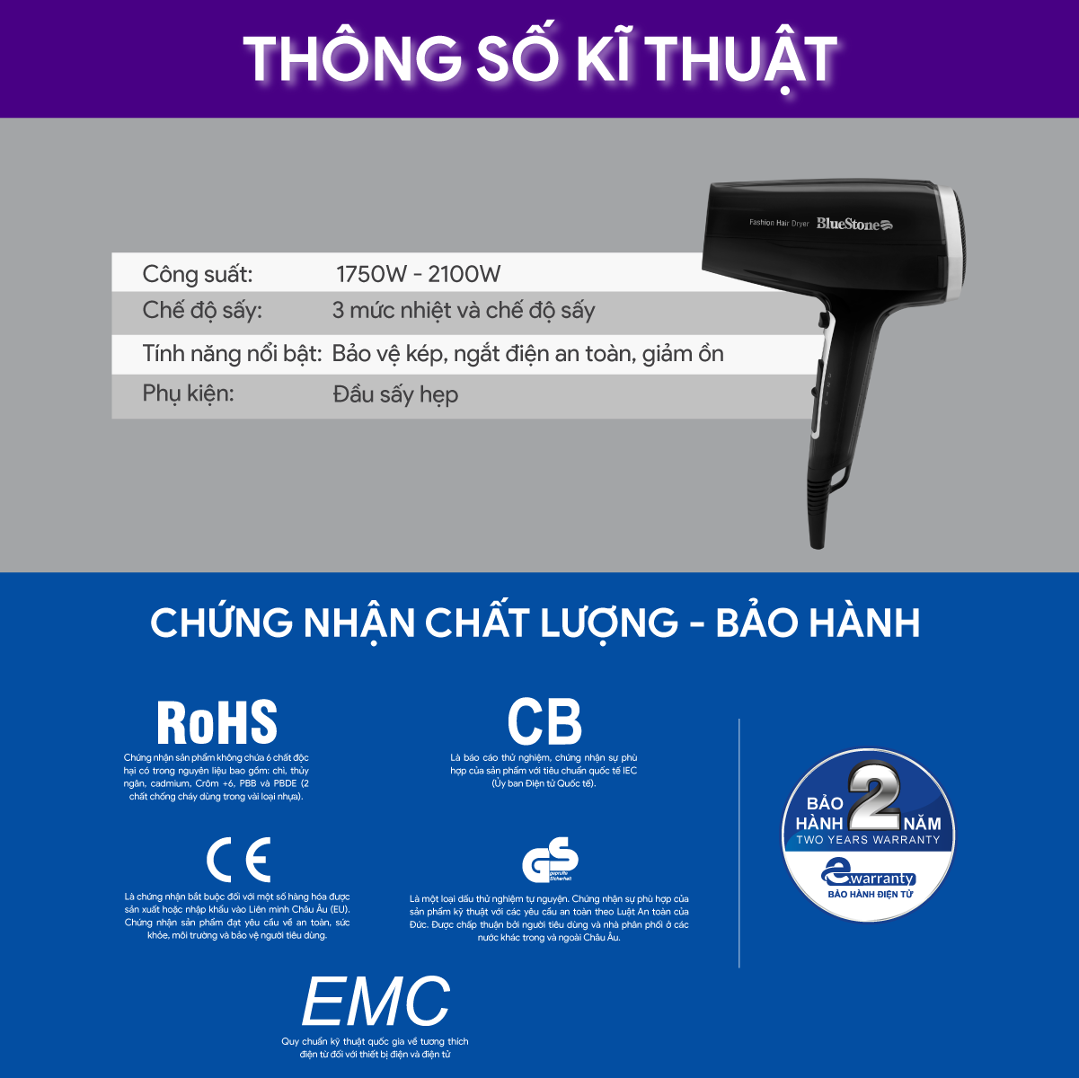 ✨Máy sấy tóc Bluestone HDB-1846 , Công Suất 2100W , Hàng chính hãng