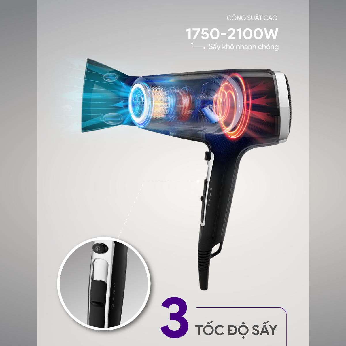 Động cơ không chổi than tốc độ cao 110.000 rpm, tốc độ gió 65m/s, làm khô tóc ngắn chỉ trong 40 giây Cảm biến kiểm soát nhiệt thông minh NTC, kiểm soát nhiệt độ 100