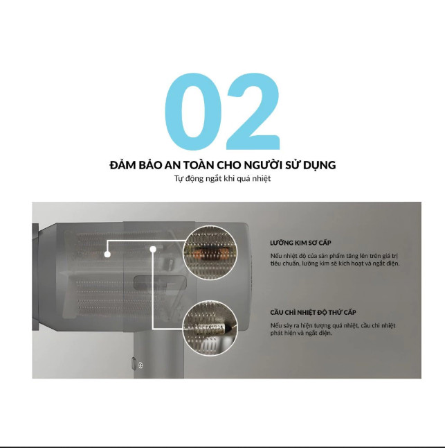 Động cơ không chổi than tốc độ cao 110.000 rpm, tốc độ gió 65m/s, làm khô tóc ngắn chỉ trong 40 giây Cảm biến kiểm soát nhiệt thông minh NTC, kiểm soát nhiệt độ 100