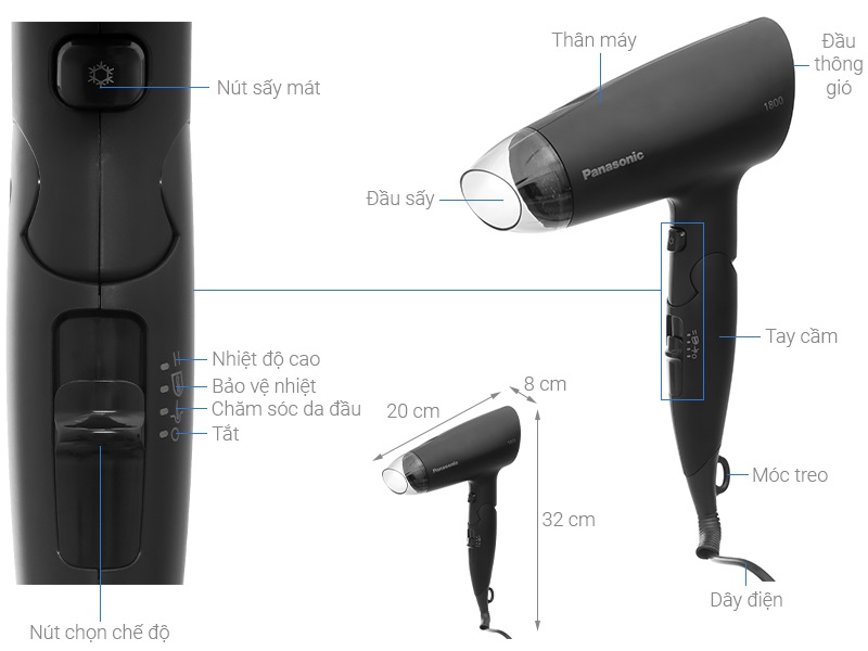 Máy sấy tóc Panasonic với thiết kế nhỏ gọn, dễ cầm nắm cùng công suất hoạt động mạnh mẽ 1800W giúp tóc nhanh khô, tiết kiệm thời gian sấy tóc Có 2 tốc độ sấy