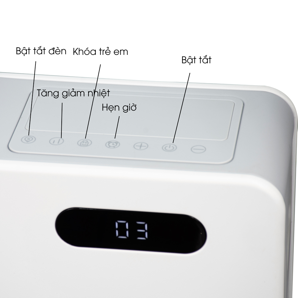 Ưu điểm nổi bật của quạt sưởi sàn Tiross TS9447 Kèm điều khiển từ xa Tiross TS9447 trang bị điều khiển từ xa chỉnh nhiệt độ thuận tiện nhất. Điều khiển từ xa có một nút ấn để tắt màn hình. Chỉnh 2 mức nhiệt độ Máy sưởi gốm có 2 mức nhiệt độ tùy chỉnh, tương ứng với công suất 1.100W/2.200W. Máy có thể cài đặt nhiệt độ khởi động mặc định là 35 độ C C và phạm vi điều chỉnh là 15 - 35 độ C. Hẹn giờ, khóa trẻ em Máy có chức năng hẹn giờ 24 giờ, tính năng khóa trẻ em sẽ đảm bảo an toàn khi sử dụng. Về thiết kế Chân đế máy cực kỳ vững chắc, tay cầm lớn dễ dàng di chuyển. Máy kèm bình chứa nước để tạo ẩm cho phòng, thiết kế đạt chuẩn chống nước IP24. Bộ phận làm nóng được làm bằng tấm nhôm giúp tản nhiệt nhanh hơn. Quạt sưởi sàn Tiross TS9447 trang bị màn hình kỹ thuật số LED, dễ vận hành và tự động tắt màn hình. Tính an toàn cao Máy sưởi ceramic Tiross thiết kế công tắc chống lật, có chức năng bảo vệ quá nhiệt.