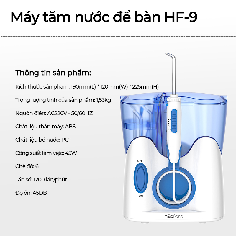 Máy tăm nước H2ofloss HF-9 là dòng máy tăm nước để bàn dùng cho gia đình chuyên nghiệp. Đi kèm 12 đầu tăm thay thế: 4 đầu tăm tiêu chuẩn, 2 đầu dành cho chỉnh nha/niềng răng, 2 đầu cho nha chu, 2 đầu cho lưỡi, 2 đầu cho mũi. Dung tích bình nước 800ml. Máy tăm nước H2ofloss HF-9 có 6 chế độ cài đặt áp lực nước trong đó có 1 chế độ tạm dừng “Pause”. Áp lực nước có thể điều chỉnh ở rải rộng từ 5-110 PSI. Đáp ứng tối đa nhu cầu của nhiều người dùng, và nhiều tình trạng răng miệng. Chỉ cần chọn một mức độ phù hợp bạn sẽ thấy việc sử dụng máy tăm nước H2ofloss rất dễ dàng và thoải mái. Máy tăm nước H2ofloss HF-9 là bản nâng cấp của HF-8. Thiết kế mới giúp máy giảm độ ồn tốt hơn HF-8 và có độ yên tĩnh hơn nhiều so với hầu hết các thương hiệu trên thị trường. Theo thông số kỹ thuật hãng đưa ra. Độ ồn của HF-9 là <50db. Các hãng máy khác có độ ồn ở mức < 70db. Máy tăm nước H2ofloss HF-9 có khả năng tự ngừng hoạt động khi quá nóng và có thể khởi động lại sau 2h giúp duy trì độ bền tốt hơn. THÔNG SỐ KỸ THUẬT MÁY TĂM NƯỚC H2OFLOSS HF-9