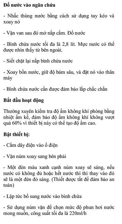 Nước được đưa vào không khí dưới dạng hơi, không nóng, không mùi, đảm bảo vệ sinh.