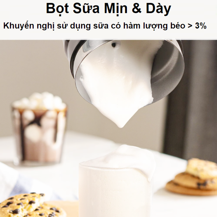 - Có thể tạo bọt tối đa 130 ml, hâm nóng sữa (không bọt) tối đa 300 ml. Có vạch hiển thị giúp bạn đong chính xác, tránh tràn sữa. (Khuyến nghị dùng sữa nguyên kem để đạt kết quả tốt nhất). Whisk đa năng