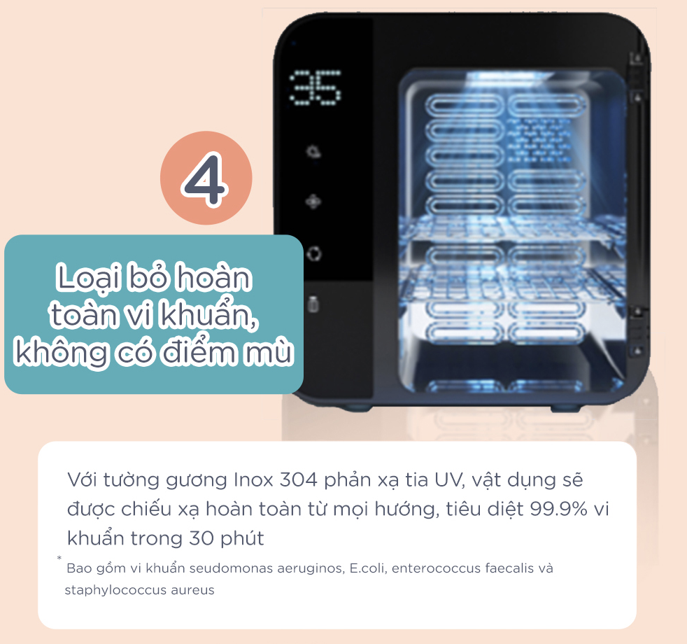 Chế độ chỉ tiệt trùng: Hãy cho vào bình sữa, núm ty, ty ngậm và phụ kiện hút sữa và sau đó cài đặt thời gian 35 hoặc 45 phút tùy ý.