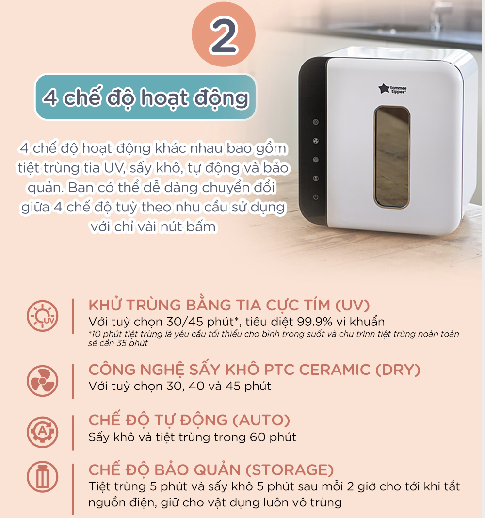 Máy tiệt trùng UV và sấy khô Tommee Tippee tích hợp các tính năng thông minh và dễ dàng tiệt trùng, sấy khô và bảo quản bình sữa và các phụ kiện, nhờ đó bạn có thể bảo vệ cái bụng nhỏ xinh của bé luôn được an toàn. Tia cực tím (UV) là một dạng ánh sáng bước sóng ngắn mắt thường không nhìn thấy, có thể tiêu diệt 99.9% các vi sinh vật, vì vậy đây là cách thức hiệu quả để loại trừ vi khuẩn có hại, nấm mốc, virus và các mầm bệnh khác mà không cần dùng đến chất hóa học.