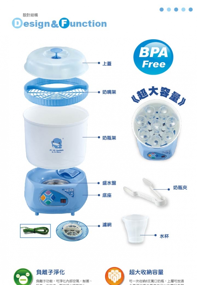 Máy có kích thước rộng rãi, có thể khử trùng và sấy khô cùng lúc 8 bình sữa và các món phụ kiện khác giúp bạn tiết kiệm thời gian và chi phí hiệu quả.