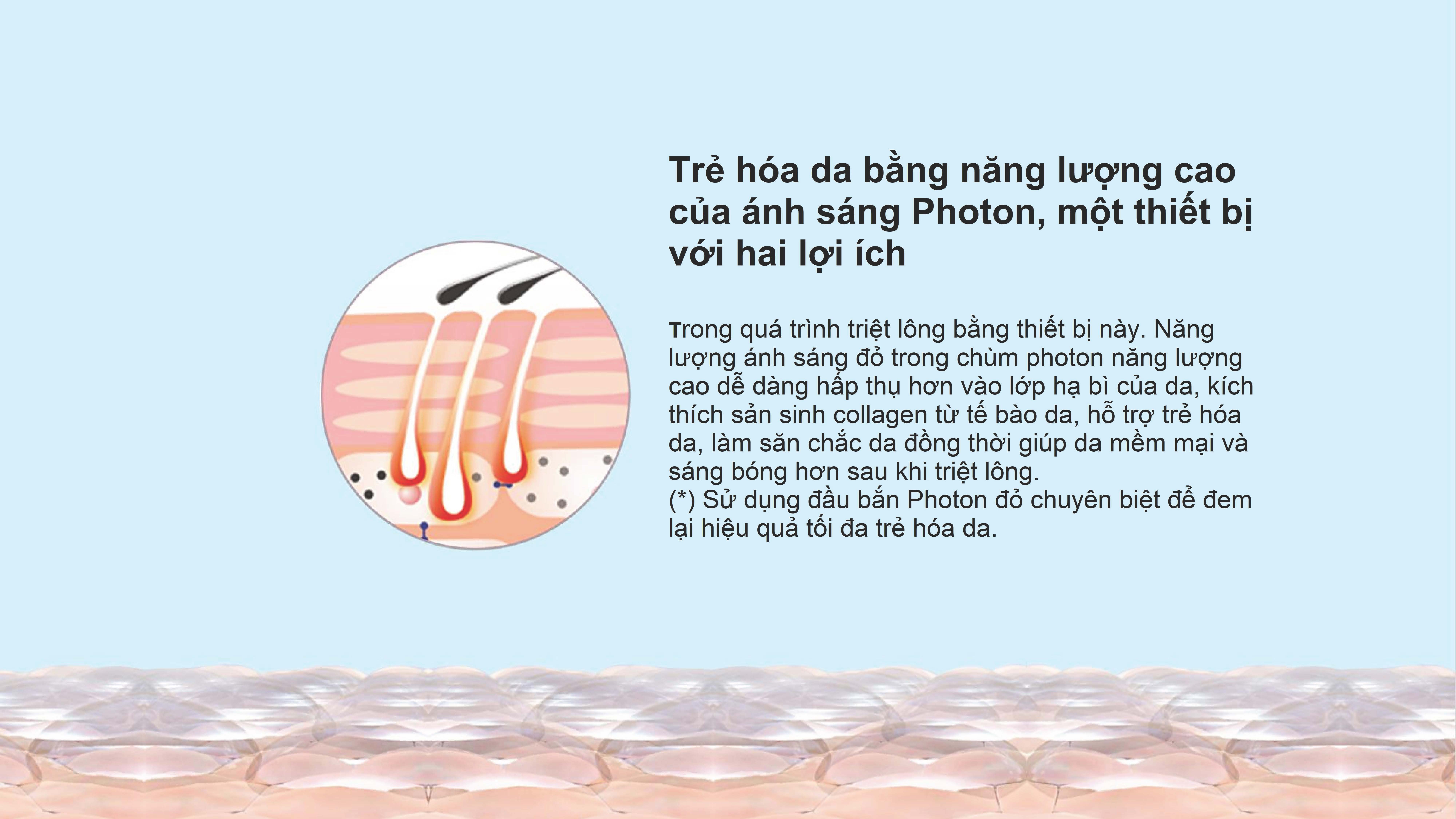 Ứng dụng công nghệ ánh sáng xung cường độ cao IPL và chế độ triệt lạnh, tích hợp 3 chức năng: tri.ệt lông không đau rát, trẻ hoá da và tr.ị mụn. Với thiết kế