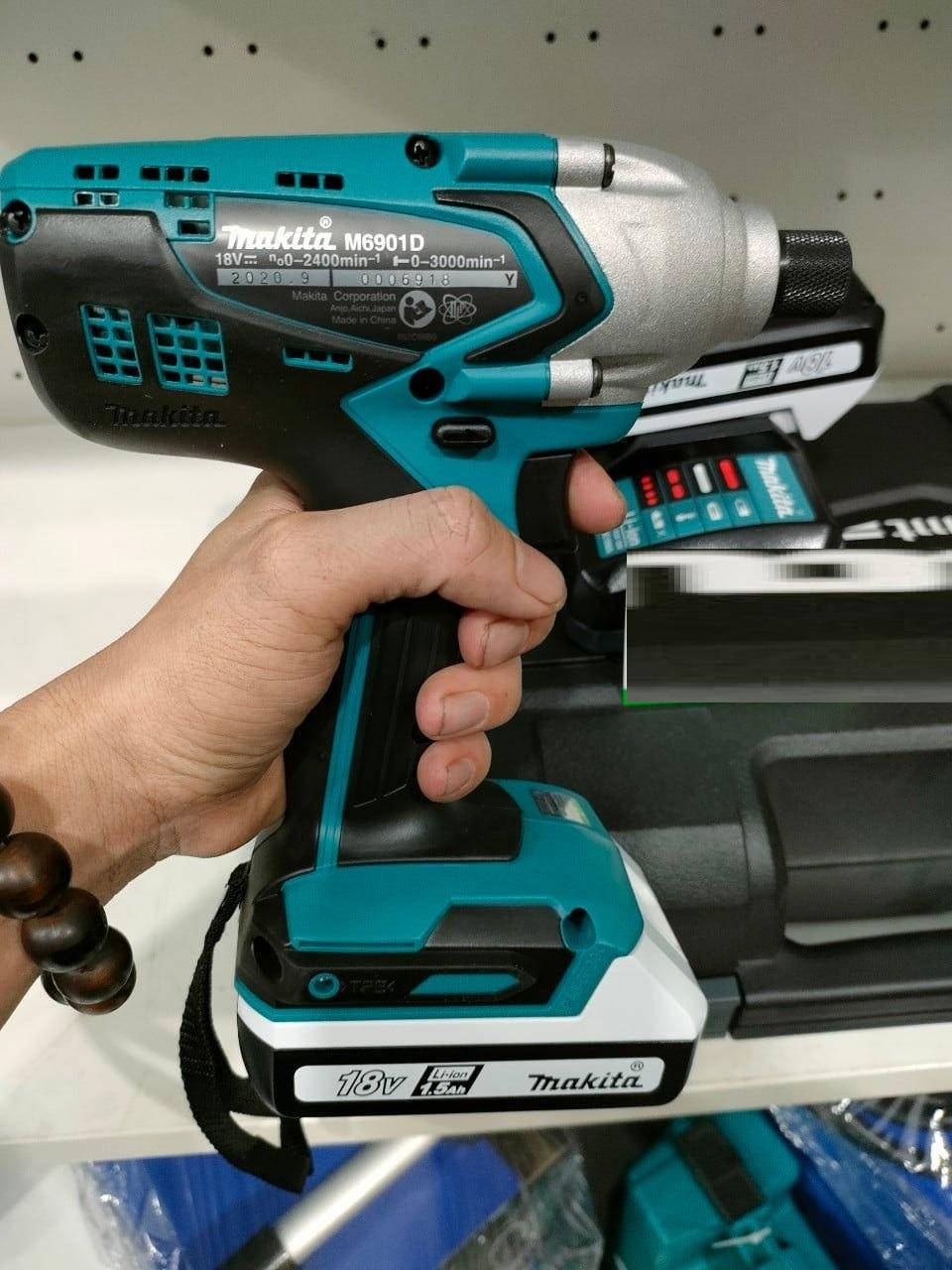 Trong hộp có: Máy, đế sạc nhanh, 2 pin 18Vx1.5Ah, vali nhựa.